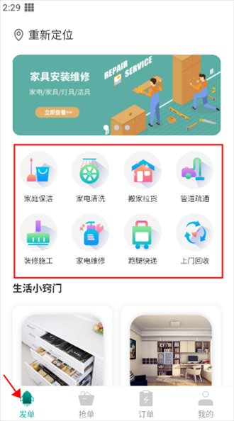 1、打开已下载的应用,点击下方的“发单”按钮,在发单页面选择所需的服务类型。以家庭保洁为例。