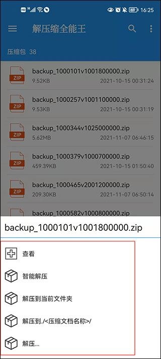 2、接着,软件会自动扫描手机中的所有压缩包文件,选择需要解压的文件。